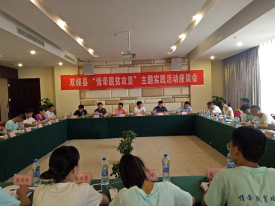 7月29日下午,我校2017年暑期大学生“情牵脱贫攻坚”座谈会在双峰县召开。我校副校长刘宇、双峰县委书记禹敏、常务副县长龙燕青、县委常委、我校团委书记赵小群、副县长杨斌,我校学生工作处副处长欧阳伶俐、扶贫工作队鲁云生以及师生代表25人参加座谈会。会议由龙燕青主持。