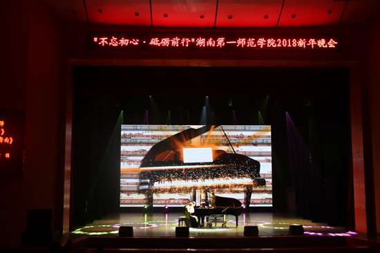 在观众阵阵掌声中,一师二附小表演的歌舞情景剧《红色记忆》闪亮登场,拉开了晚会的帷幕,孩子们手举红旗长矛,演绎红军艰苦历程,表达了他们对祖国母亲的无限热爱;诗朗诵《站在岁月肩膀上远眺》回顾2017卓越成就,展望2018全新气象,表达了一师学子对未来的向往和昂扬奋发的精神面貌;京剧《花田错》,有板有眼,传承弘扬优秀戏曲文化;舞蹈《侗帕》翩若惊鸿、宛若游龙,风雅脱俗;流行歌曲Bang Bang、Music Together节奏轻快明朗,散发出流行音乐的青春魅力;钢琴与弦乐《浏阳河》曲调清澈婉转,优美流畅;古典舞《水墨·潇湘》灵动飘逸,宛如一缕缭烟,又犹如隔雾之花,湖湘文化在其中熠熠生辉;茅古斯舞《祟》用精湛的舞技和民族化元素,表达出土家文化的特有魅力;民乐合奏《花好月圆》将中国传统乐器扬琴、琵琶、二胡、笛子完美融合,使传统艺术在舞台上焕发出无限生机与活力。晚会不仅有上述学生带来的精彩表演,还有老师们的联袂合作,“黄金搭档”樊小欢、徐稳老师的钢琴四手联弹,娴熟有力,用手指弹奏出一个又一个美丽的故事。最后,这场视听盛宴在欢快的歌伴舞《为祖国干杯》中完美谢幕。