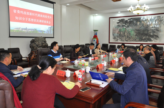 3月29日下午,省委统战部副部长胡东风、省委统战部知工处处长曾志君、副处长张小庆一行4人来到我校,就“新时代湖南高校党外知识分子思想状况” 进行调研。校党委书记彭小奇、校长童小娇、党委副书记刘志敏、组织统战部、宣传部、人事处负责人以及学校党外知识分子代表参加调研座谈会。刘志敏主持会议。