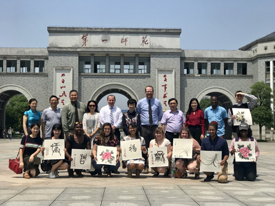 东斯特劳斯堡大学师生先在城南书院校区参观了毛泽东与第一师范纪念馆,后来到东方红校区参观并进行座谈、开展有关活动。我校10名志愿者学生为来访的美国学生展示了书画与篆刻、京剧、民乐演奏等中国传统文化艺术,美方学生热情高涨、积极互动,场面十分融洽。在教师座谈会上,童小娇校长介绍了我校校史与现状,教育科学学院院长蒋蓉重点推介了我校学前教育专业,与东斯特劳斯堡大学代表就两校合作举办学前教育专业进行探讨。会议结束后,两校签署了合作意向书。