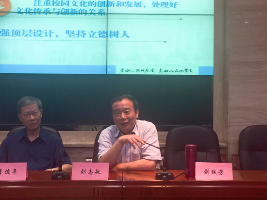 在下午举行的首届文化强校互动论坛上,刘志敏作为论坛专家与湖南师范大学等高校学者和专家就推动文化强校、增强文化自信等主题进行了交流讨论。我校城南书院李程老师在论坛上作了《革命精神筑灵魂,红色文化助梦想,谱写师范教育新篇章--构建新时代校园文化的“一师模式”》的专题发言,介绍了我校利用红色文化和革命传统文化进行校园文化建设取得的经验和成果。