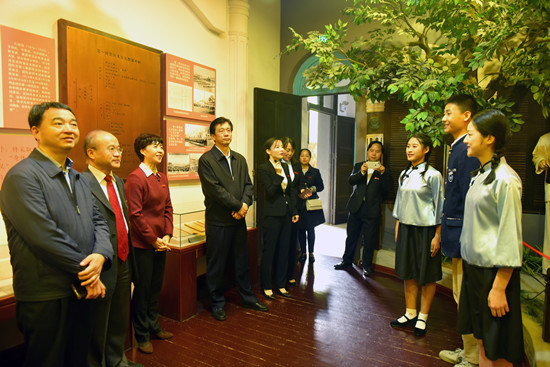 蔡振红一行来到了我校城南书院校区,走进毛泽东与第一师范纪念馆,参观了我校校史馆以及毛泽东在此求学任教时的八班教室、寝室、水井、阅报室等,了解了我校发展的历史沿革以及毛泽东在湖南第一师范的求学经历。
