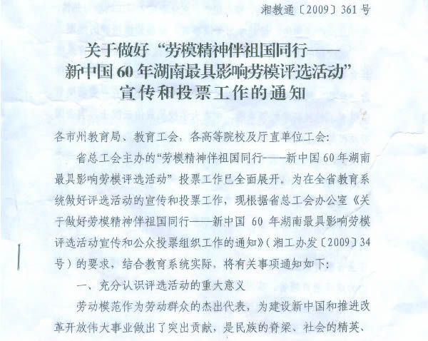 关于做好"劳模精神伴祖国同行─新中国60年湖南最具影响力劳模评选活动"宣传和投票工作的通知