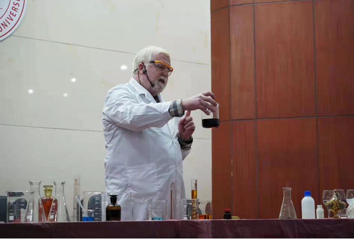 12月14日下午,北京化工大学特聘教授、英国皇家化学会北京分会主席戴伟(David G. Evans)教授应我校与省科协联合海智基地项目的邀请,为我校师生带来了一场题为《化学……无处不在》的科普讲座。物理与化学学院刘志敏教授、国际交流处处长何晓澜及学校部分师生参加了讲座,讲座由许兰副院长主持。