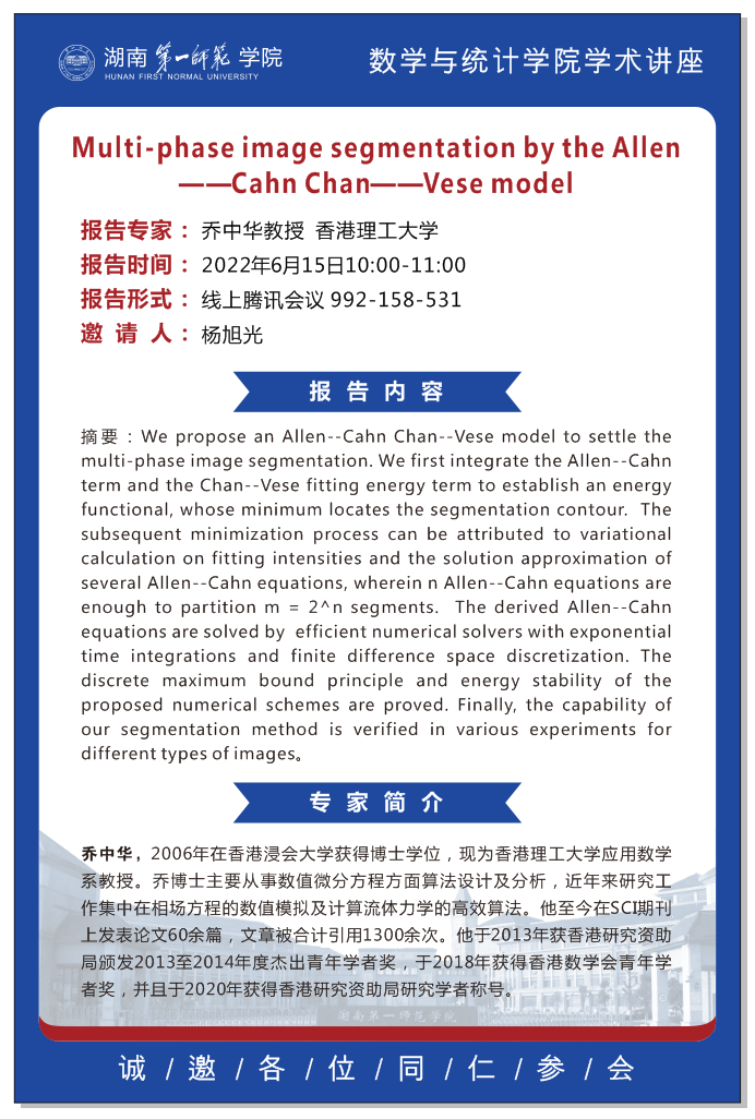 学术预告|Multi-phase image segmentation by the Allen--Cahn Chan--Vese model