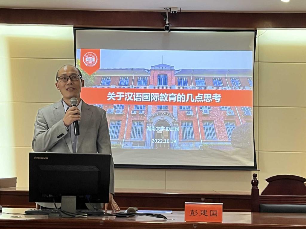 10月19日,湖南大学中国语言文学学院副院长、博士生导师彭建国教授应邀在特立南112会议室开展了题为“关于汉语国际教育的几点思考”的讲座。讲座由文学与新闻传播学院副院长王霞教授主持,龙永干院长、汉语国际教育系主任王正博士、汉语国际教育系学生等100余人参加了此次讲座。