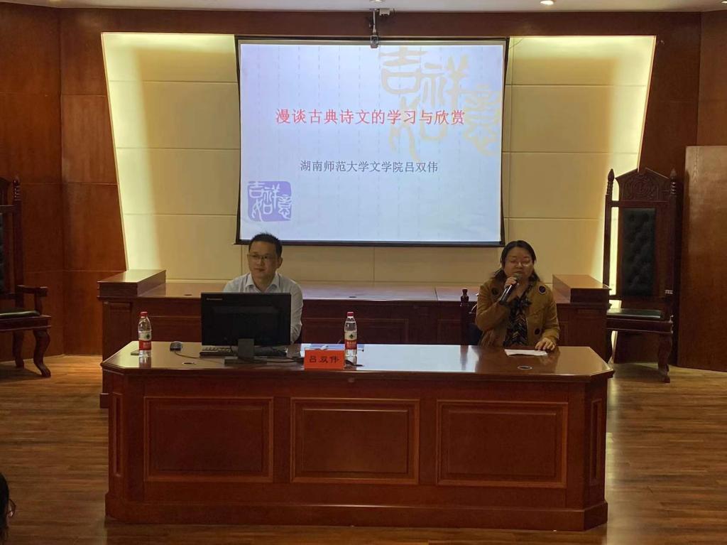 2022年10月20日下午,湖南师范大学文学院副院长、博士生导师吕双伟教授应邀在特立南112(模拟法庭)为我院师生开展主题为“漫谈古典诗文的学习与欣赏”的学术讲座。讲座由学院副院长王霞主持,汉语言文学专业学生100余人参加。