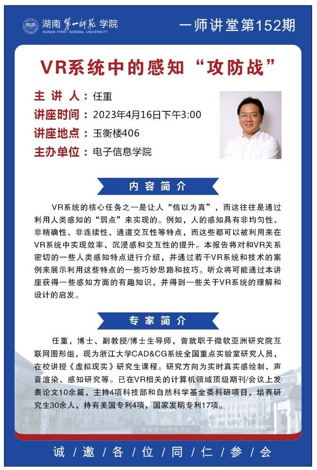 学术预告|一师讲堂第152期:VR系统中的感知“攻防战”