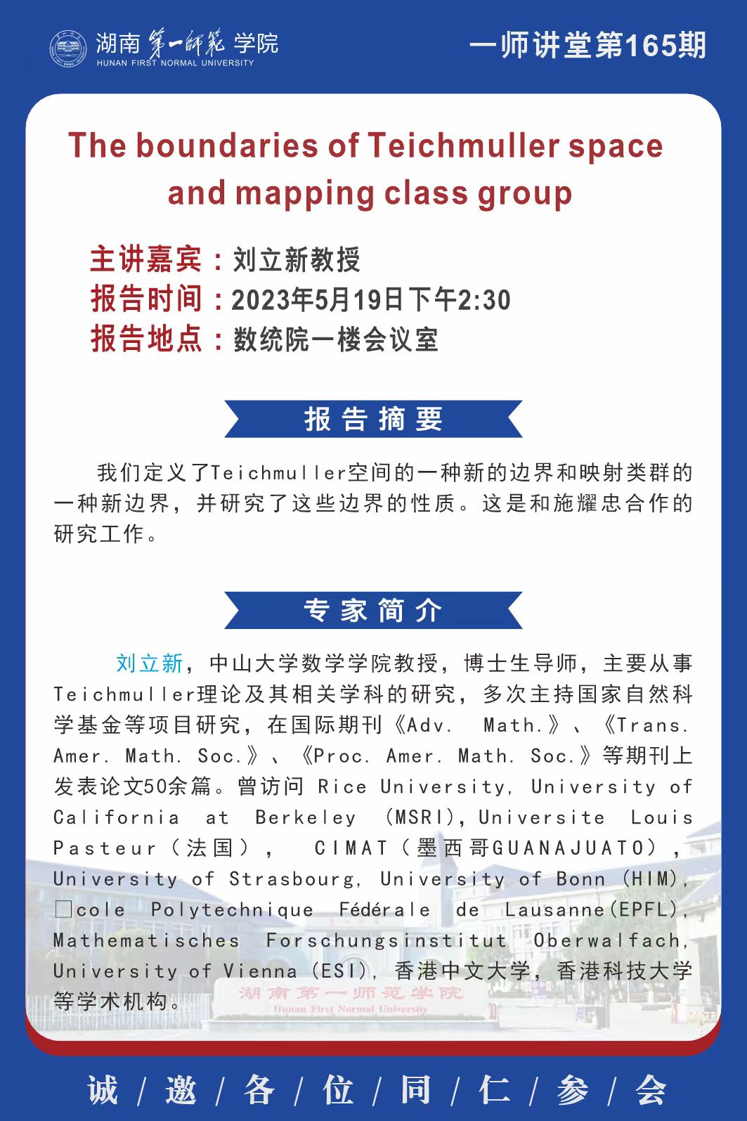 学术预告|一师讲堂第165期:The boundaries of Teichmuller space and mapping class group
