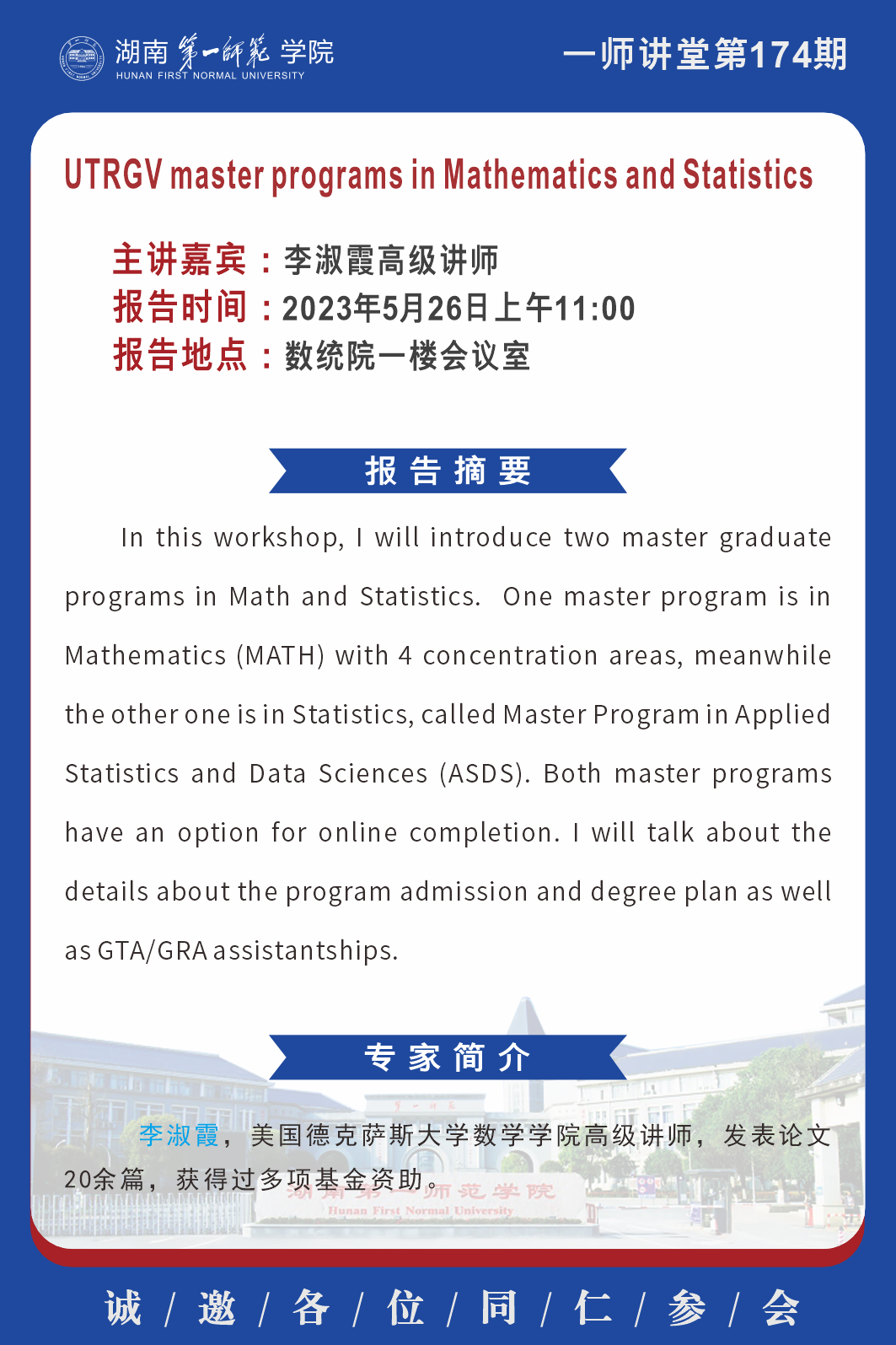 学术预告|一师讲堂第174期:UTRGV master programs in Mathematics and Statistics