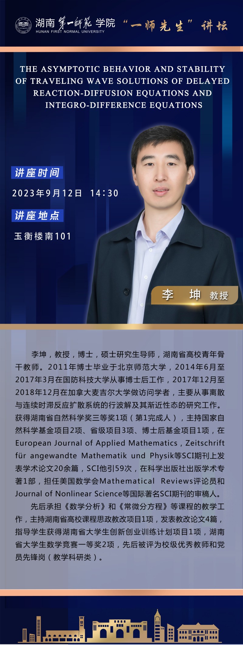 学术预告|“一师先生”讲坛第三期:The asymptotic behavior and stability of traveling wave solutions of delayed reaction-diffusion equations and integro-difference equations
