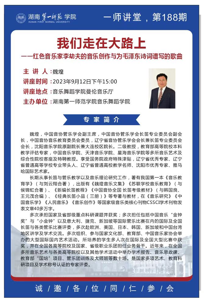 学术预告|一师讲堂第188期:我们走在大路上——红色音乐家李劫夫的音乐创作与为毛泽东诗词谱写的歌曲
