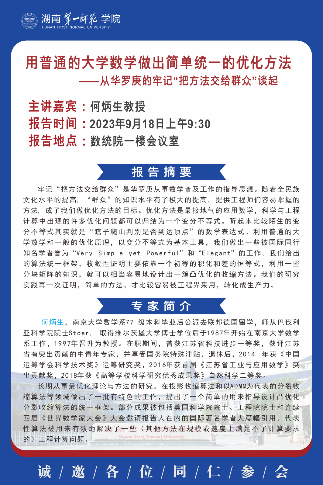 学术预告|学术讲座:用普通的大学数学做出简单统一的优化方法——从华罗庚的牢记“把方法教给群众”谈起