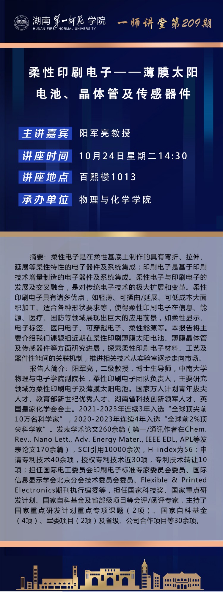 学术预告|一师讲堂第209期:柔性印刷电子——薄膜太阳电池、晶体管及传感器件