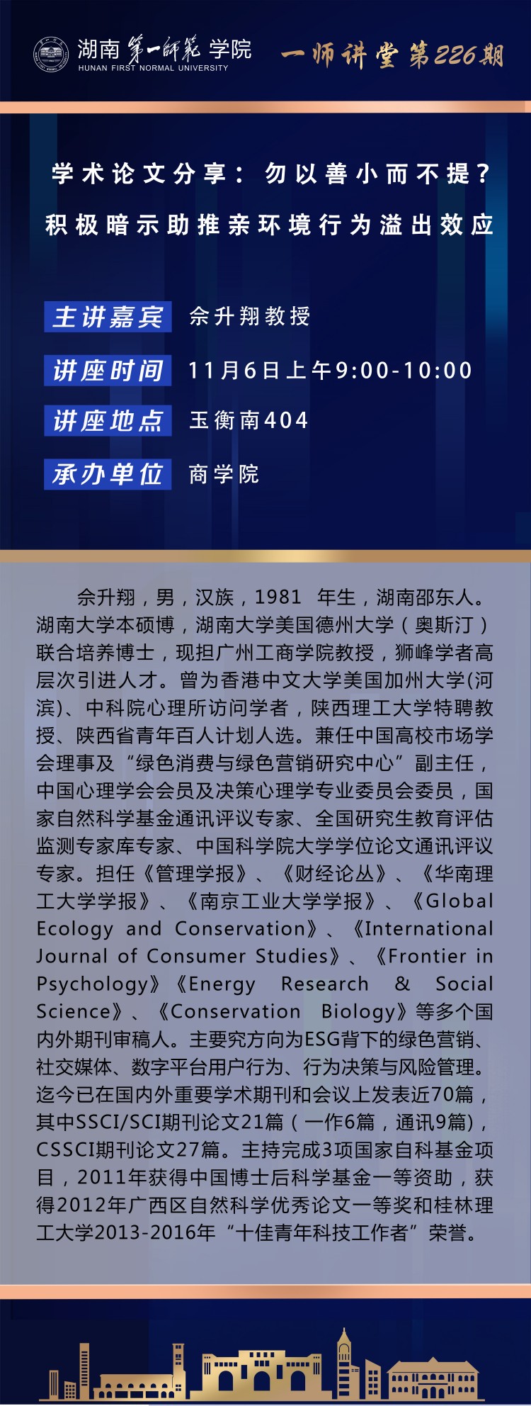 学术预告|一师讲堂第226期:学术论文分享:物以善小而不提?积极暗示助推亲环境行为溢出效应-87978797威尼斯