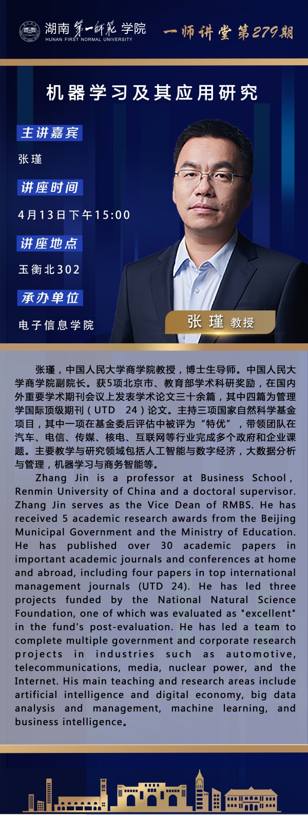 学术预告|一师讲堂第279期:机器学习及其应用研究