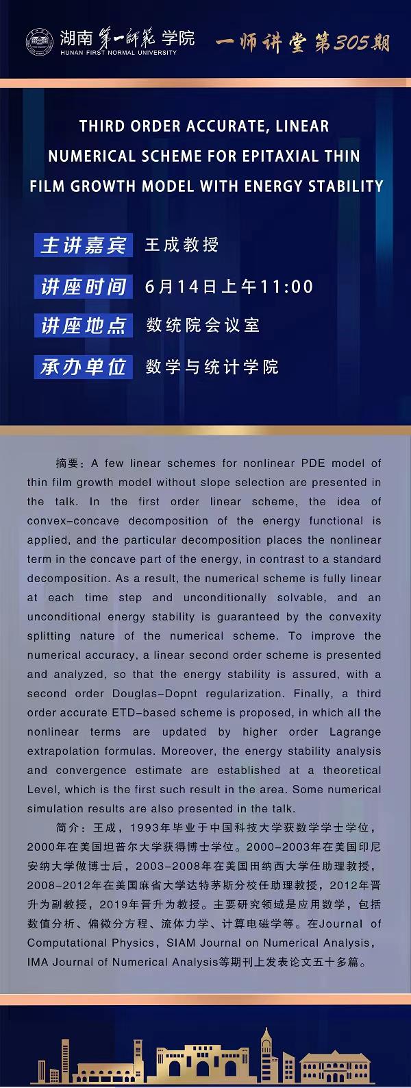 学术预告|一师讲堂第305期:THIRD ORDER ACCURATE, LINEAR NUMERICAL SCHEME FOR EPITAXIAL THIN FILM GROWTH MODEL WITH ENERGY STABILITY-87978797威尼斯