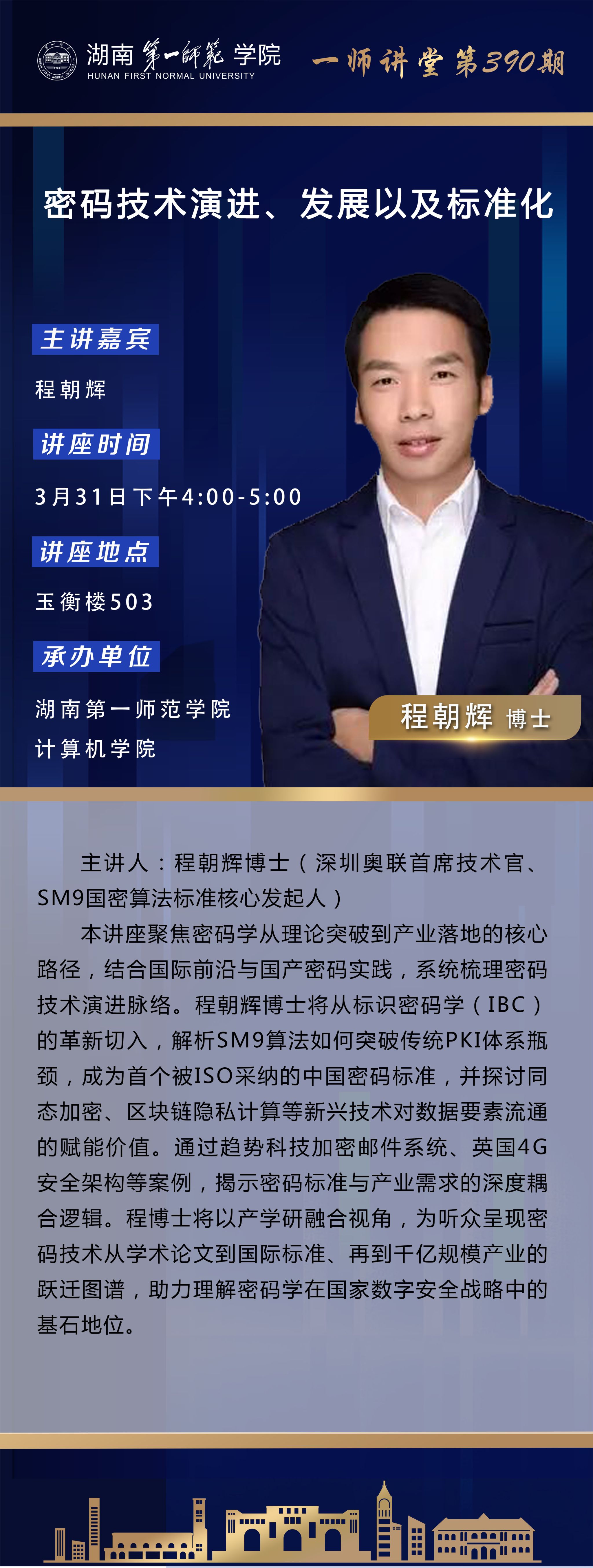 学术预告|一师讲堂第390期:密码技术演进、发展以及标准化