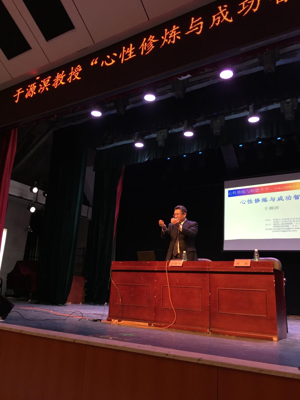 20171119日上午,山东聊城大学教育学学科院院长、教授、硕士研究生导师于源溟教授应邀来我校为师生开展了一场题为“心性修炼与成功智慧”的讲座,讲座由教育科学学院院长蒋蓉教授主持,到场师生近400余人。