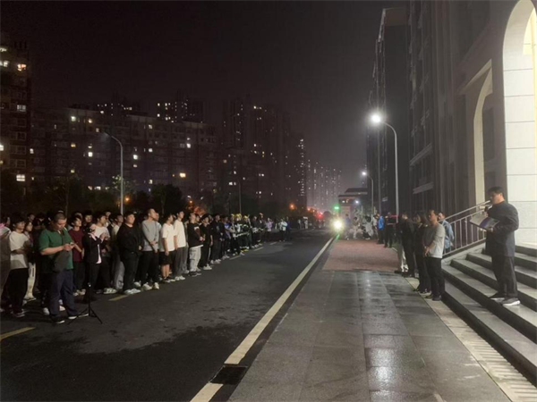 行动组在演习行动开始后,通过广播发出警报信号,18号楼1800多名学子,在各楼层负责疏散工作的老师提醒和协助下,按既定线路有序地撤离宿舍楼。仅仅用时2分多钟,同学们就全部安全抵达前坪并集合完毕。各班迅速清点人数,向总指挥员报告情况。