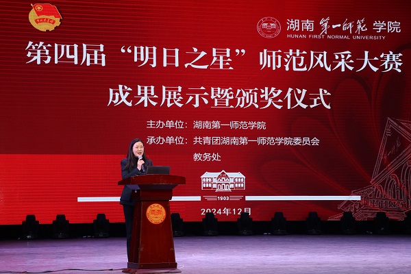 12月10日,我校第四届“明日之星”师范风采大赛成果展暨颁奖仪式在东方红校区田汉剧场举行。校党委委员、副校长蒋蓉出席活动并讲话。学生工作部、教务处、校团委负责人,各二级学院党委副书记、分团委书记及指导老师、学生代表参加活动。此次活动采用线下观看、线上同步直播的形式,观看人数累计4000余人。