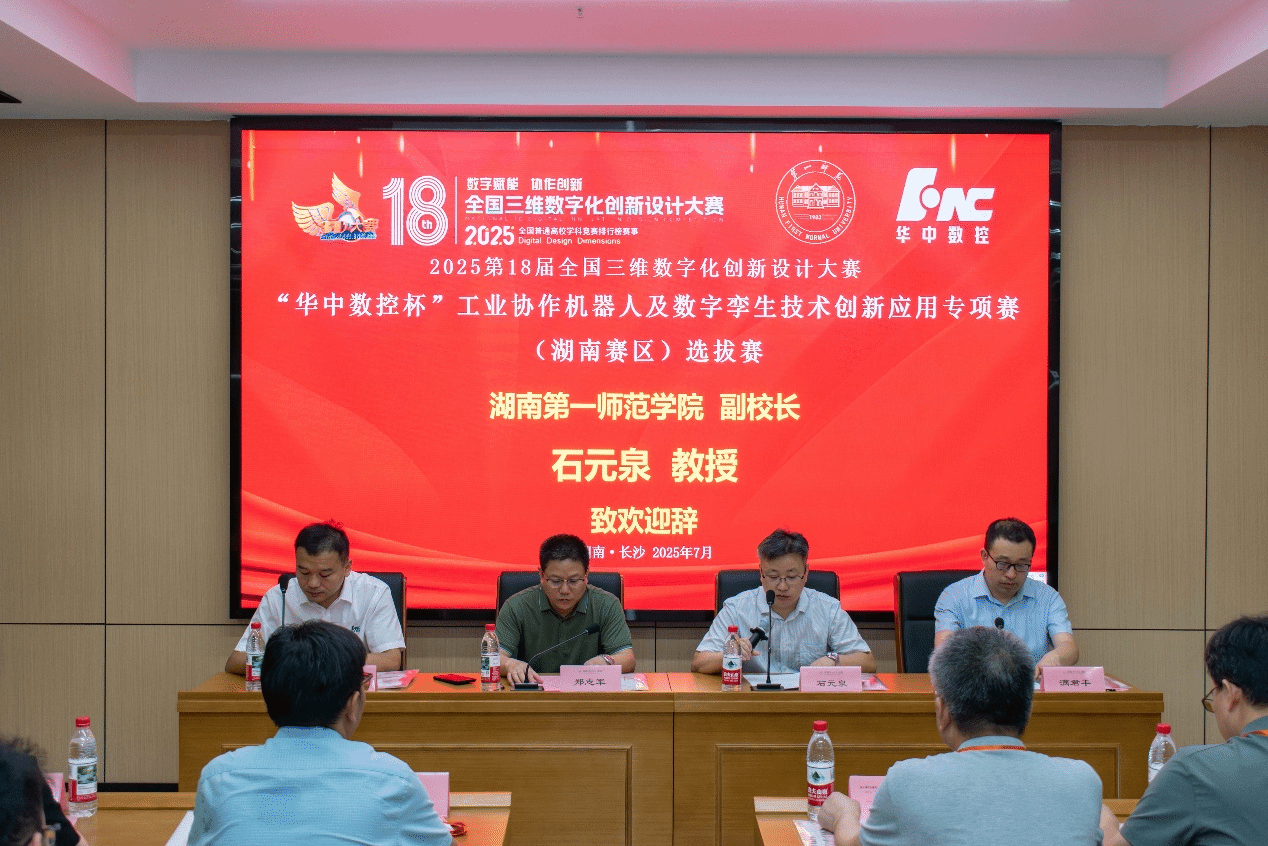 7月5日-6日,第18届全国三维数字化创新设计大赛“华中数控杯”工业协作机器人及数字孪生技术创新应用专项赛湖南赛区选拔赛在我校金城楼举办。全国三维数字化创新设计大赛专家委员巡视员兼湖南赛区裁判长、华南理工大学工程训练中心主任郑志军教授,我校副校长石元泉教授出席开幕式。